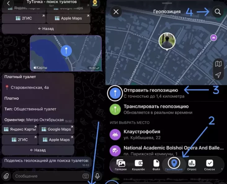 Dastatkova pierajści pa spasyłcy, adkryć Telegram-bota i adpravić hieałakacyju. Paśla hetaha bot adrazu pakaža śpis najbližejšych prybiralniaŭ. Zastajecca tolki vybrać padychodziačy varyjant i adkryć kartku z apisańniem i maršrutam u Jandieks Kartach, 2HIS, Google Maps abo Apple Maps.