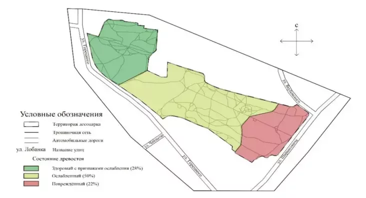 Absalutnaja bolšaść drevastojaŭ była pryznana zdarovaj abo prosta asłablenaj, što źjaŭlajecca absalutnaj normaj dla lesu, zacisnutaha ŭ ščylnaj haradskoj zabudovie.