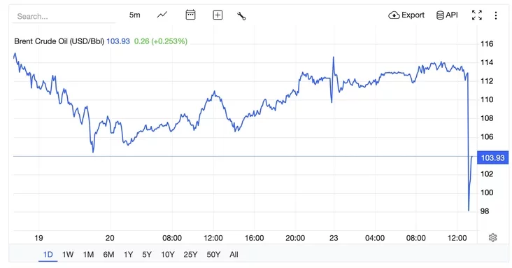 Rynak adreahavaŭ na zajavu prezidenta ZŠA Donalda Trampa. Jon daručyŭ na piać dzion abmiežavać lubyja vajennyja ŭdary pa iranskich elektrastancyjach i enierhietyčnaj infrastruktury, kab praciahnuć pieramovy z krainaj.