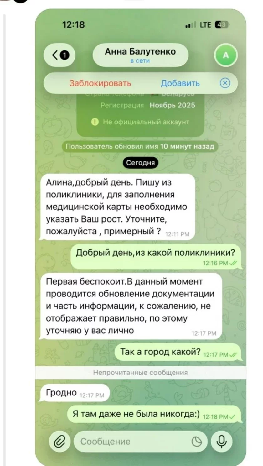 Biełaruska Alina prademanstravała ŭ Threads skrynšoty pierapiski z machlarami. U telehramie dziaŭčynie napisali z akaŭnta, jaki byŭ padpisany Hanna Bałucienka. Darečy, adrazu kidajecca ŭ vočy toje, što jaho ŭładalnik źmianiŭ imia za 4 chviliny da pačatku pierapiski.