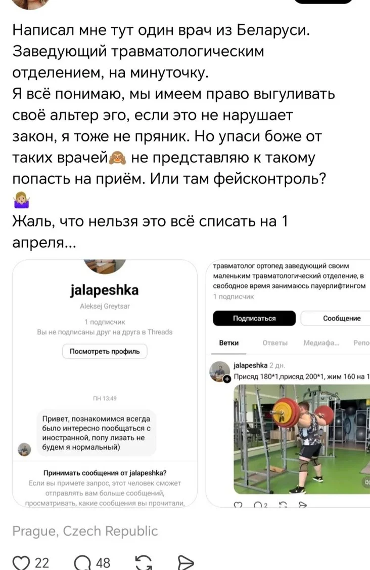 Zahadčyk traŭmatałahičnaha adździaleńnia Kaściukovickaj centralnaj balnicy Alaksiej Hrejcar nie abmiažoŭvaje siabie etykaj. Piša ŭ Threads, što nie ŭsich ludziej treba ratavać, a maładym kaleham raić «zabić ch*j na paklikańnie».
