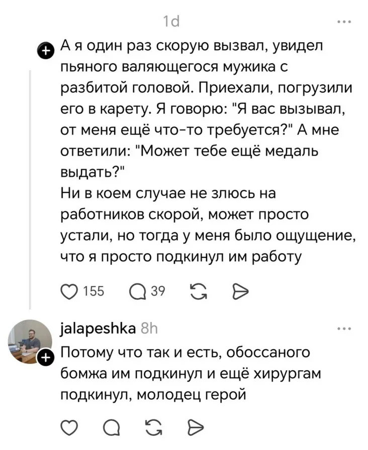 Inšy chłopiec padzialiŭsia, jak nočču ŭ studzieni 40 chvilin stajaŭ pobač z mocna pjanym maładym chłopcam, a potym prymusiŭ chutkuju zabrać čałavieka ŭ balnicu — bo chvalavaŭsia, što na marozie toj prosta zahinie.