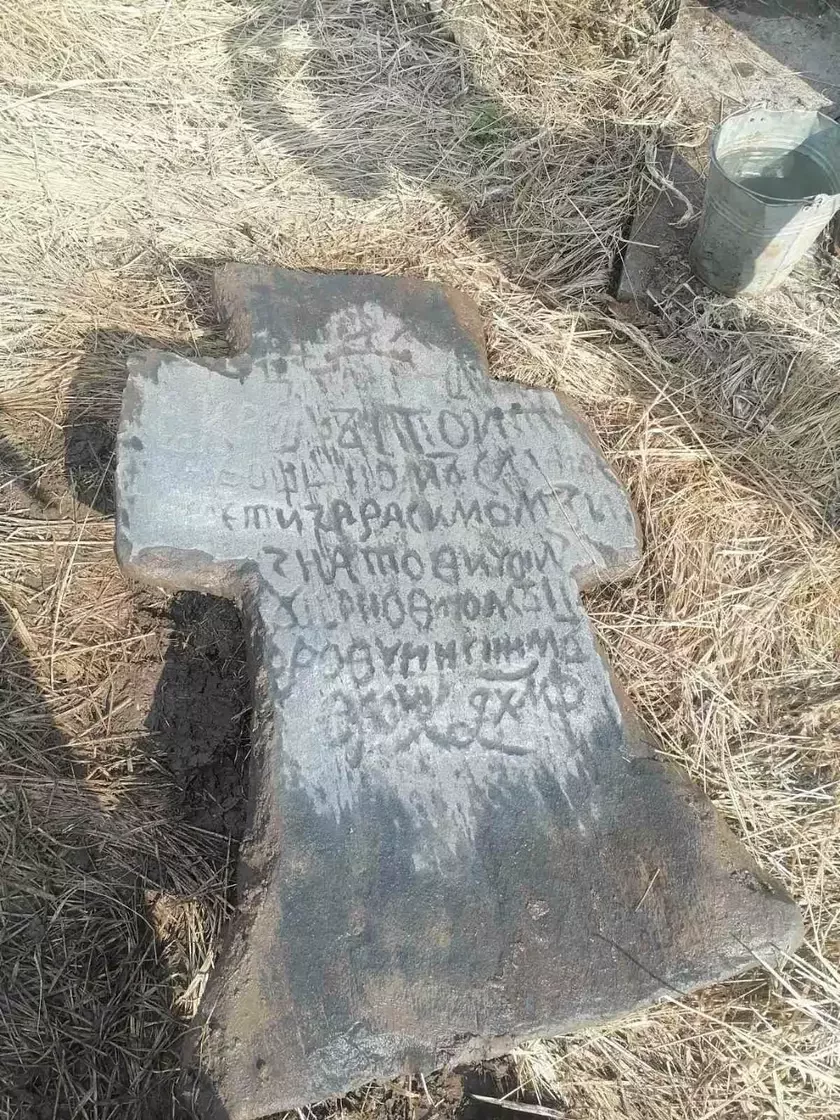 Historyk i archivist Dzianis Lisiejčykaŭ rasčytaŭ tekst, vysiečany na piarednim baku kamienia. Nadpis hučyć nastupnym čynam: «[Siej?] kryž staić [za] niabožčykam, słaŭnaje pamiaci Harasimam Ihnatavičam Ušakovičam-Karoŭčynskim, roku 1639».