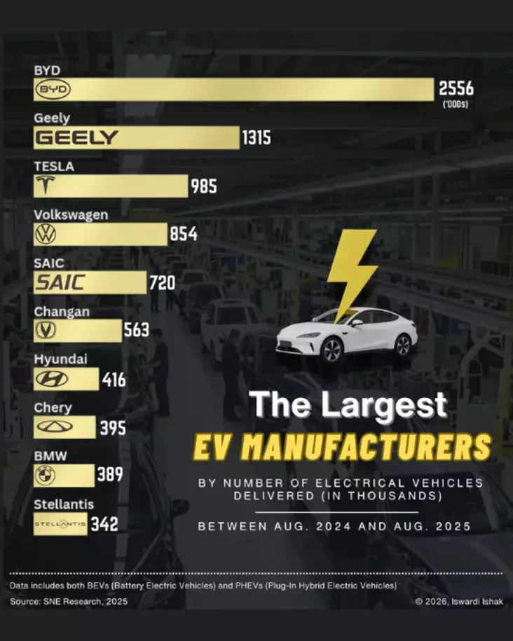 Najbujniejšym vytvorcam elektramabilaŭ u śviecie stała kitajskaja BYD. Sa žniŭnia 2024 pa žnivień 2025 hoda kampanija vypuściła 2,56 miljona mašyn, zaŭvažna apiaredziŭšy ŭsich kankurentaŭ, piša Thinktanks.pro.