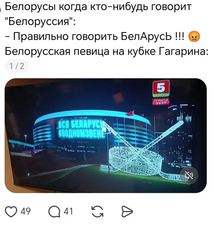 Abmiarkoŭvali i toje, što, pakul usie astatnija biełarusy pieravučvajuć rasijan kazać «Biełoruśsija», praŭładnaja śpiavačka na vialikim mierapryjemstvie praśpiavała mienavita saviecki varyjant nazvy krainy.