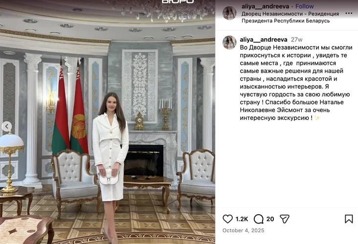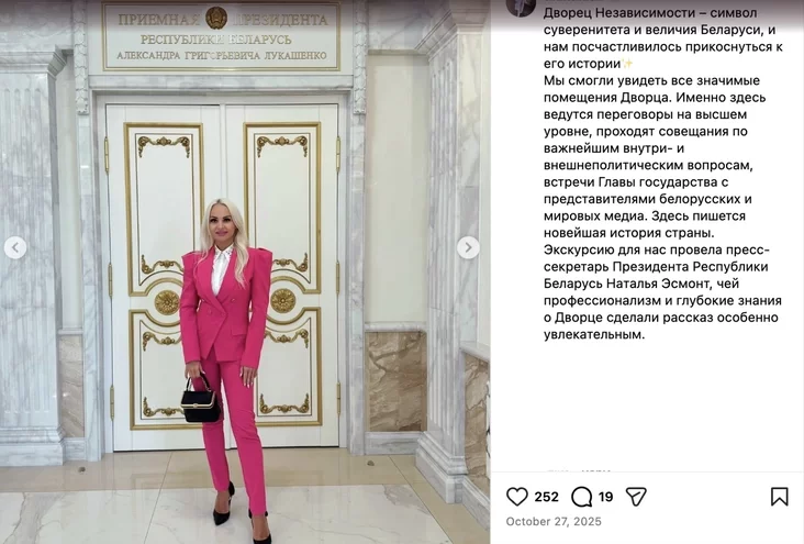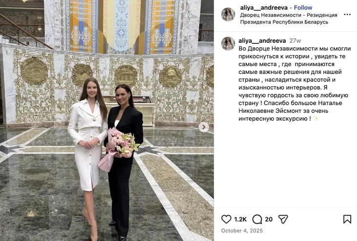Taksama Karotkaja — žadanaja hościa ŭ Pałacy niezaležnaści. U kastryčniku 2025 hoda ekskursiju joj tam praviała Natalla Ejsmant, pres-sakratarka Łukašenki.