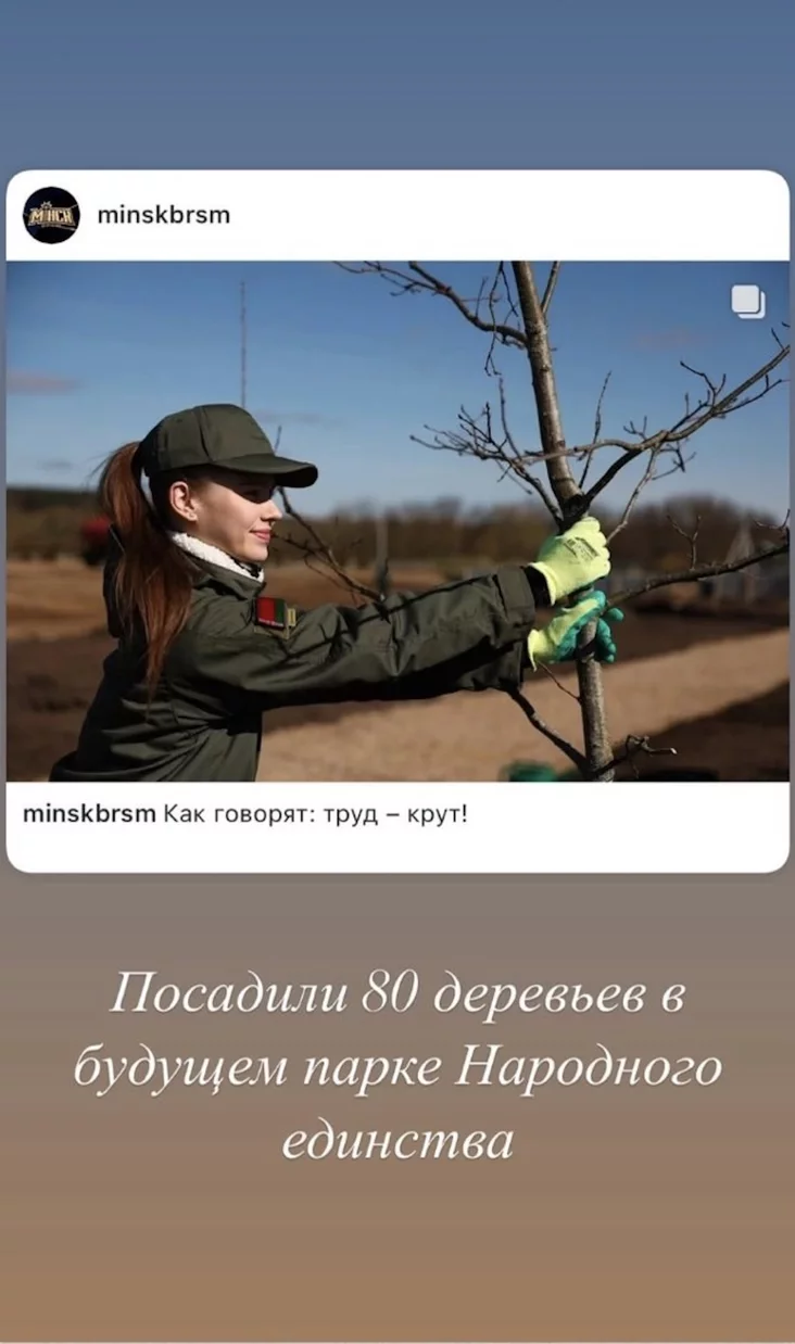Pobač z palitykam Alija apynałasia i raniej, pryčym z zajzdrosnaj rehularnaściu. U krasaviku 2025 hoda jana razam z Łukašenkam sadžała drevy ŭ budučym parku Narodnaha Adzinstva.