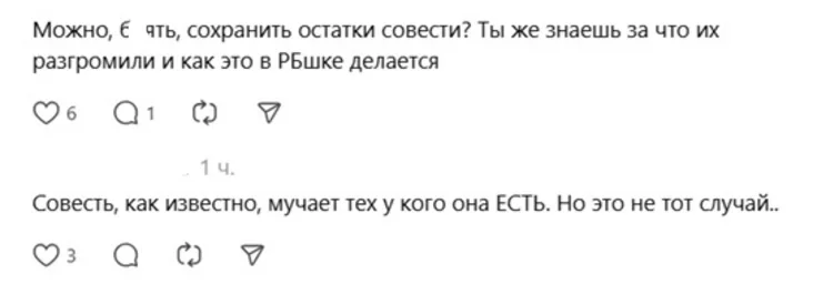 Nie abyšłosia i biez zaklikaŭ da sumleńnia: «Ci možna, bł**, zachavać reštki sumleńnia? Ty ž viedaješ, za što ich razhramili i jak heta ŭ RB robicca».