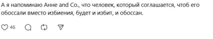 «Vyćcio stajała z bałot, što nakryli architekturnaje biuro. Pa tradycyi Treds vyŭ dva dni, potym usie zabylisia. Pahladzieła repartaž — sumy ŭražvajuć. Pytańnie padatkovaje. Chacieła b ja daviedacca, a jak tam u ich za miažoj vy**vajuć za takija schiemy? Jašče škada, što jutub prybili. Pakul znajšła, dzie pahladzieć naviny ŭ zapisie, ažno spacieła», — prakamientavała Hanna Bond (Bandarčuk) u sacsietcy Threads cikaŭnaść siłavikoŭ da architekturnaj studyi ZROBIM architects.