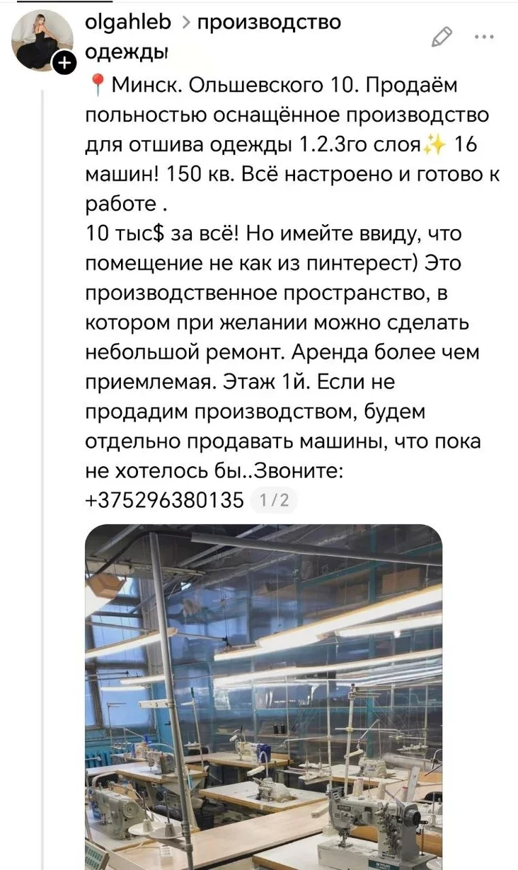 Jana apublikavała abviestku: «Usiaho 16 mašyn, nažnicy dla raskrojnaha cecha, abstalavańnie VTA, płoter dla druku lekałaŭ. Vialiki raskrojny stoł. Taksama dva stały dla kampjutaraŭ i dakumientaŭ. Stełažy, viešałki. Usio jość. Prychodźcie i pracujcie». I samo pamiaškańnie płoščaj 150 kvadrataŭ.