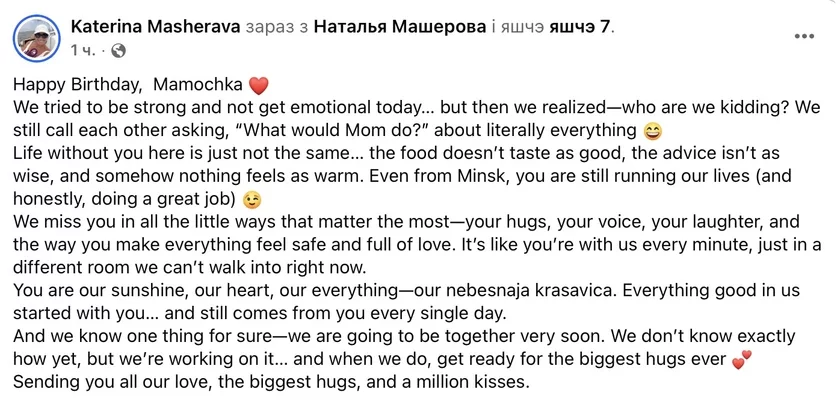 Unučka kolišniaha kiraŭnika savieckaj Biełarusi Piatra Mašerava Kaciaryna, choć naradziłasia i vyrasła ŭ Minsku, daŭno žyvie ŭ amierykanskim Čykaha. I za hety čas užo tak intehravałasia ŭ miascovuju rečaisnaść, što navat svaju maci, Natallu Mašeravu, u fejsbuku vinšuje pa-anhlijsku.