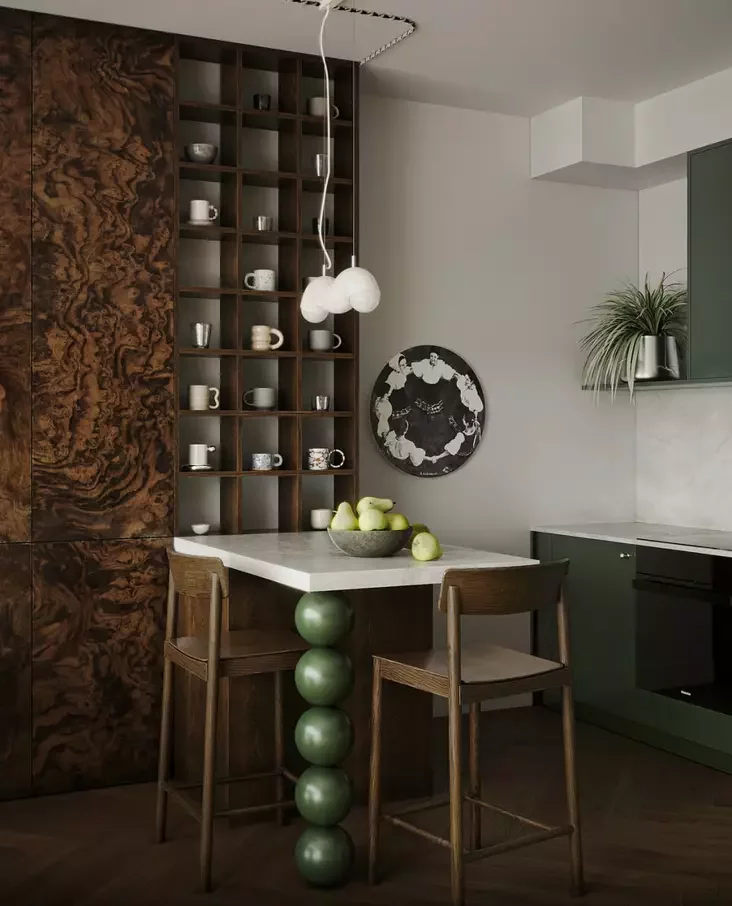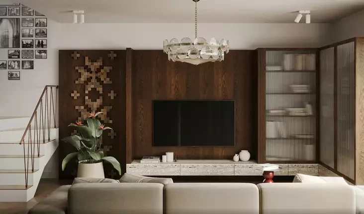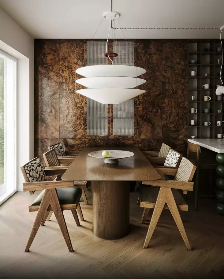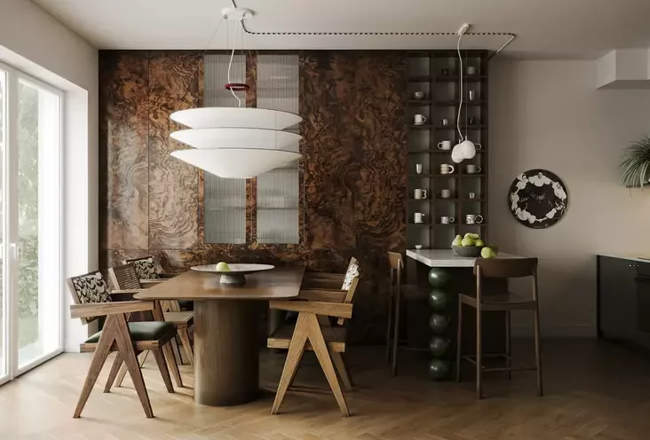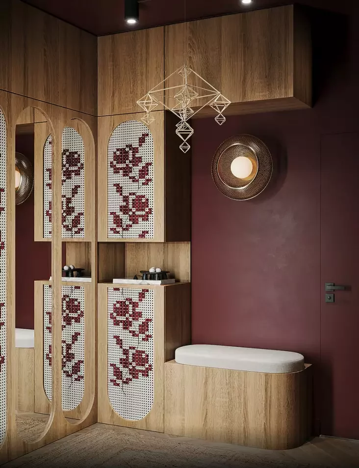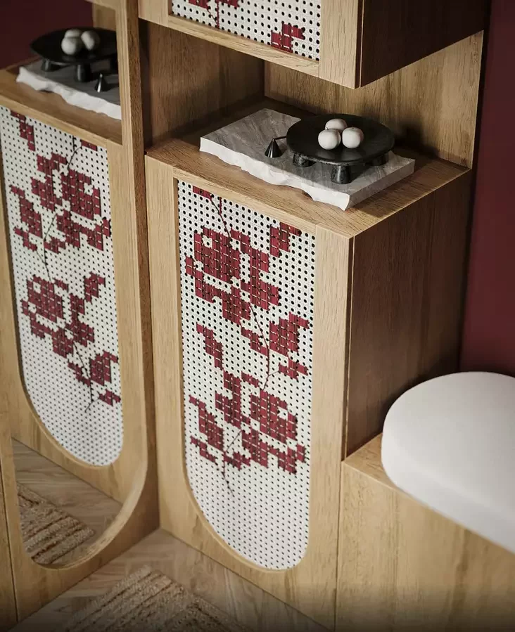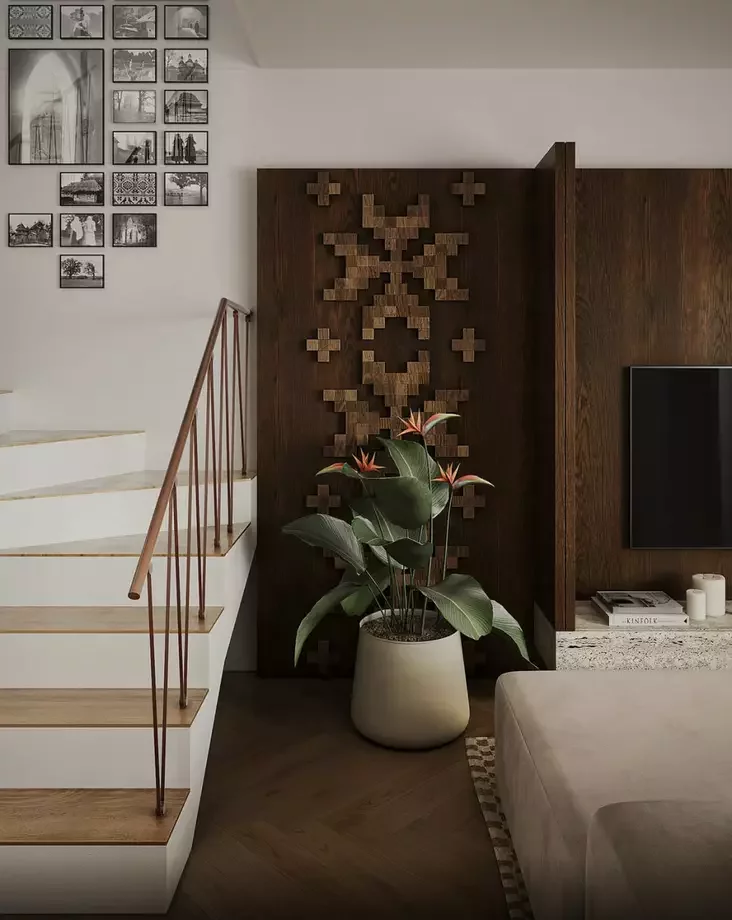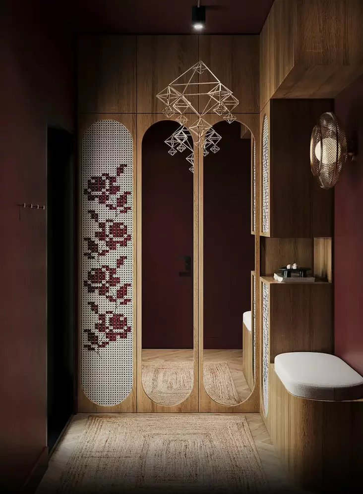 I sapraŭdy jana zmahła vielmi harmanična i niepapsova ŭpisać u interjer i arnamientalnuju vyšyŭku, i pavuka, i draŭlanyja elemienty ŭ pryrodnych, bahatych adcieńniach i aryhinalnych formach.