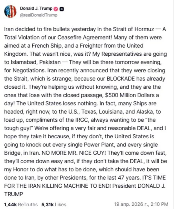 U svajoj sacyjalnaj sietcy Truth Social Donald Tramp paviedamiŭ, što iranskija siły adkryli ahoń pa francuzskim i brytanskim hruzavych karablach. Pavodle jaho słoŭ, heta źjaŭlajecca hrubym parušeńniem damoŭlenaściej ab spynieńni ahniu.