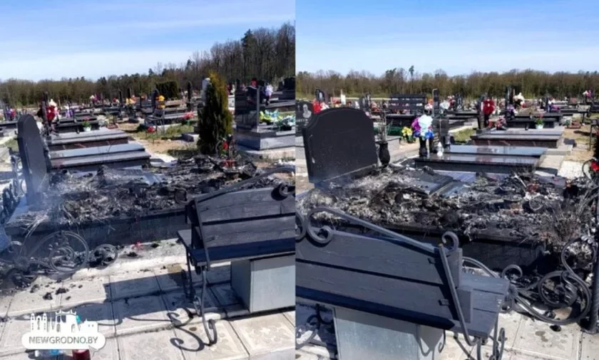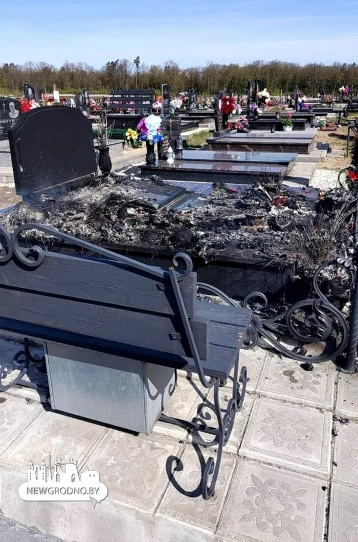 Padčas vizitu na mohiłki žančyna zaŭvažyła, što na adnoj z mahił pačaŭsia pažar — hareli štučnyja kvietki na pomniku. Joj daviałosia tušyć ahoń padručnymi srodkami. U vyniku pomnik mocna paciarpieŭ: jon byŭ zakurany i paškodžany.