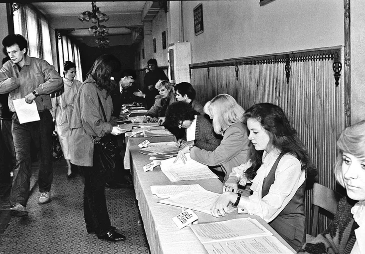 Refierendum 14 maja 1995 h. Vybary ŭ Viarchoŭny Saviet Respubliki Biełaruś. Hałasavańnie na 3‑m vybarčym učastku 251‑j Mašeraŭskaj akruhi stalicy. Minsk. Fota: Biełaruskaja encykłapiedyja