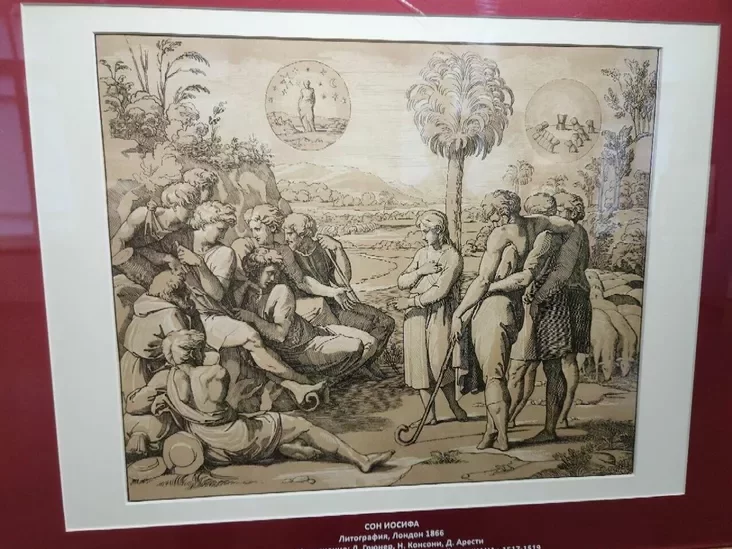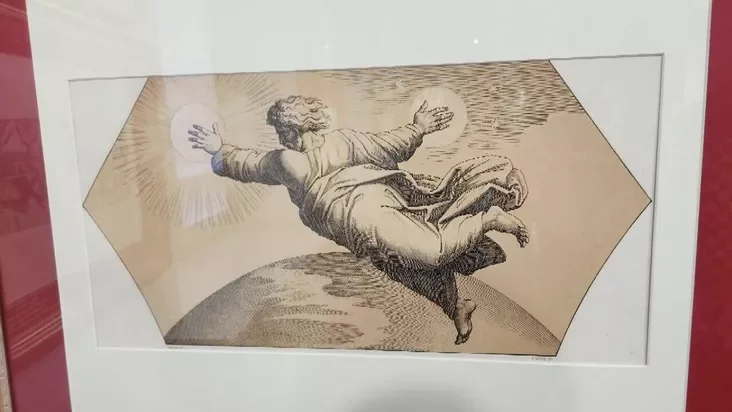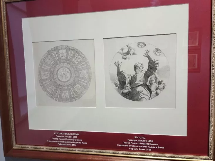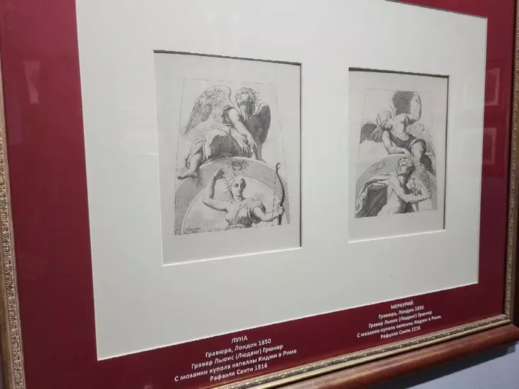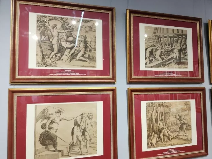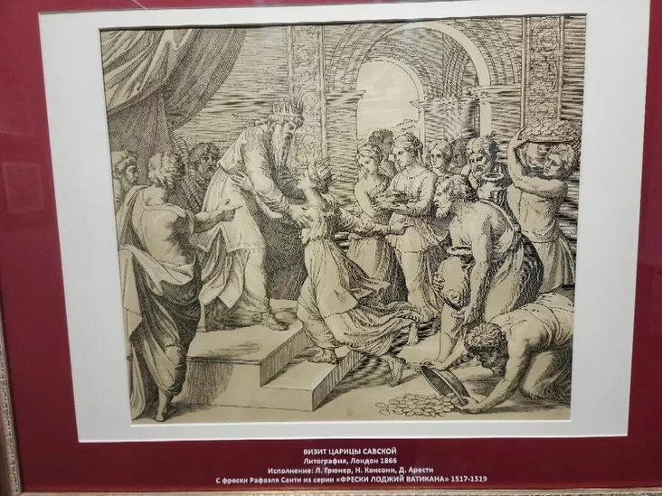 U 1866 hodzie vydatny hravior i mastak Ludvih Hrunier sumiesna ź viadomym italjanskim mastakom Nikołam Kansoni vykanali 52 tanavanyja litahrafii z fresak vialikaha farmatu ŭ styli staradaŭniaj hraviury na drevie XVI stahodździa. U poŭnym abjomie hetyja litahrafii na vystavie pradstaŭlenyja ŭpieršyniu.