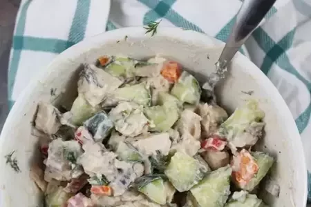 Recept na vychadnyja. Sałata z vendžanaj kurycaj i ahurkom — vysokabiałkovaja strava sa śviatočnym vodaram1515