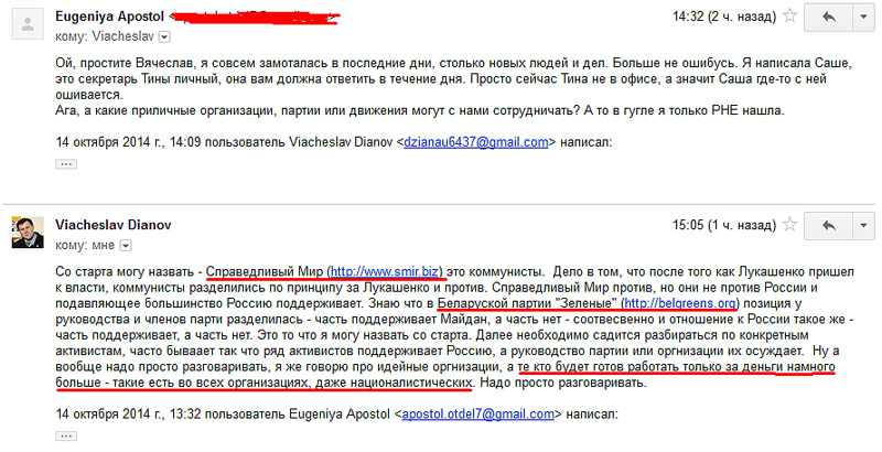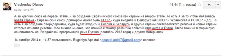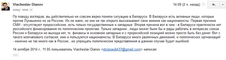 В частности, Дианову предложили возглавить информационный проект «Аист», который должен стать альтернативой «тутбаю» и «хартии» и «противодействовать белорусским националистам» накануне выборов 2015 года.