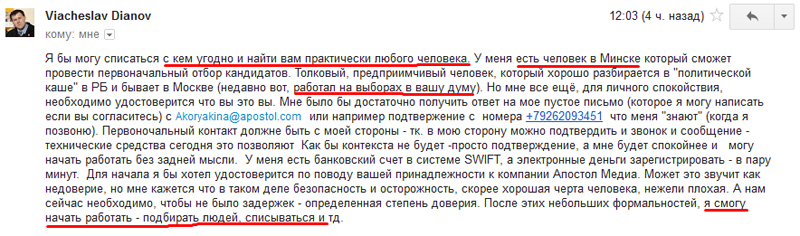 Вячеслав Дианов заявил, что подтверждает каждое слово из своей переписки с представителем «Апостол Медиа» относительно своего участия в проекте «Аист». Он сказал, что ответил бы точно так же на все вопросы на своей странице в фейсбуке: