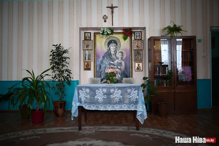 К тому же, в каждой комнате на стене икона. Их здесь много. А в комнате для отдыха — что-то наподобие небольшой молельни — на одной из стен висят иконы (и православные, и католические), на столе распятие.