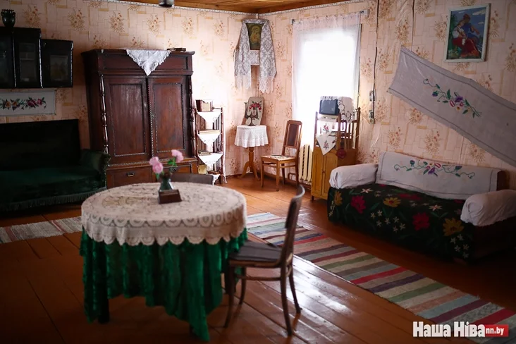 Особенно гордится Дубовик «комнатой для релаксации» — это большая комната в старом деревянном здании рядом со школой. Старая мебель, кровати, большой деревянный шкаф. В углу стоит прялка, на диване лежит домотканое льняное полотно. Есть даже старые, еще угольные, утюги.