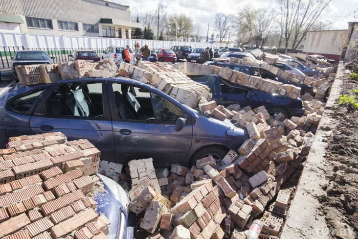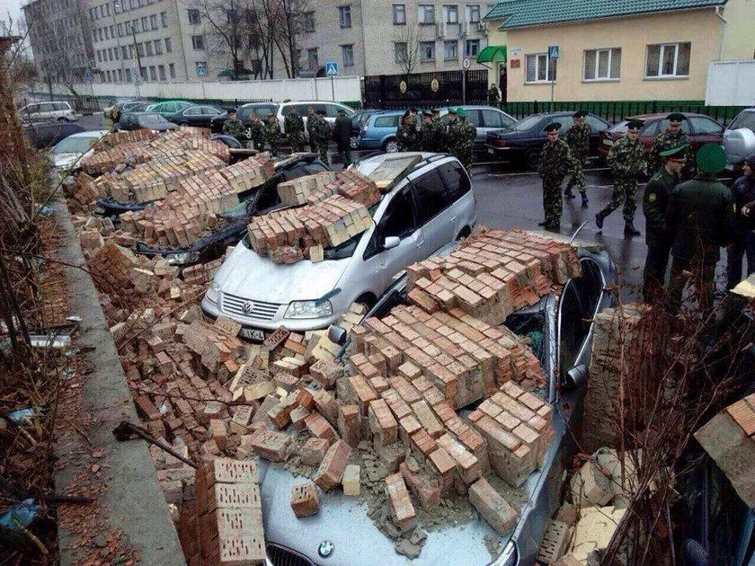 В Бресте ветер повалил кирпичную стену, раздавило десять машин