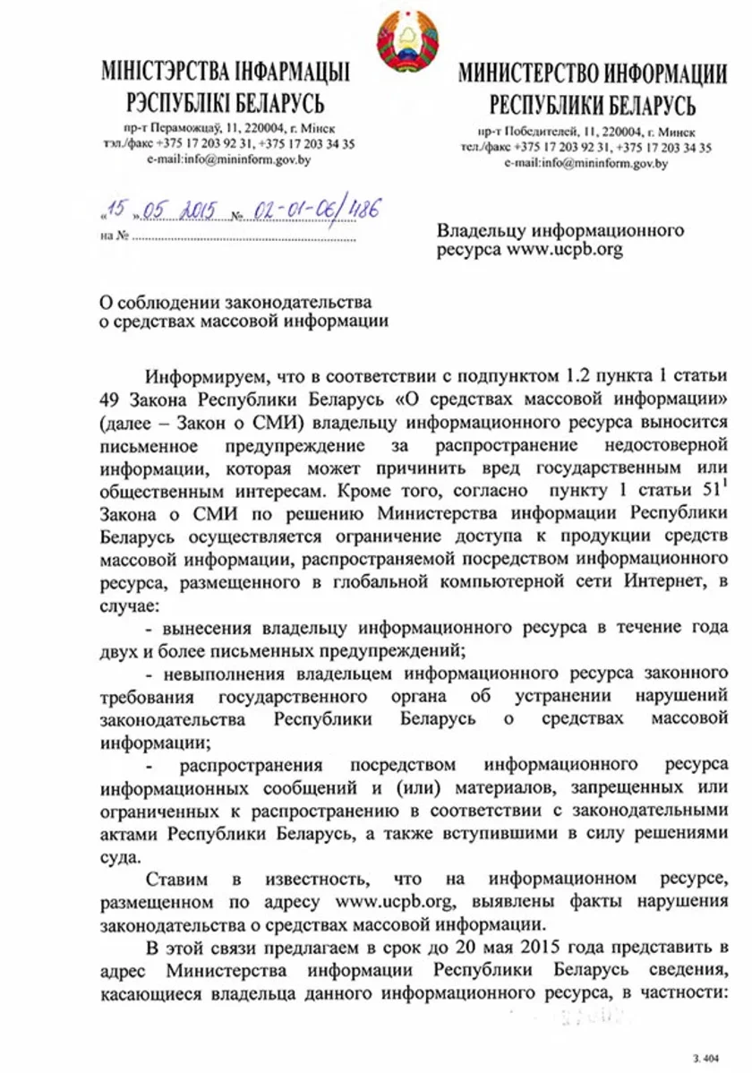 В середине мая письма Министерства информации были получены редакциями сразу нескольких интернет-ресурсов. Среди них сайт радиостанции «Радыё Рацыя», музыкальный портал «Тузін.fm», сайт Объединенной гражданской партии.