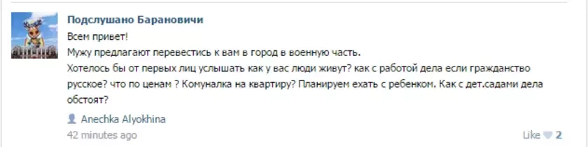 В одной из барановичских групп появился пост от россиянки Анны Алехиной — та спрашивает читателей об условиях жизни в городе, о детских садах.