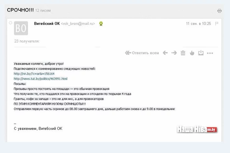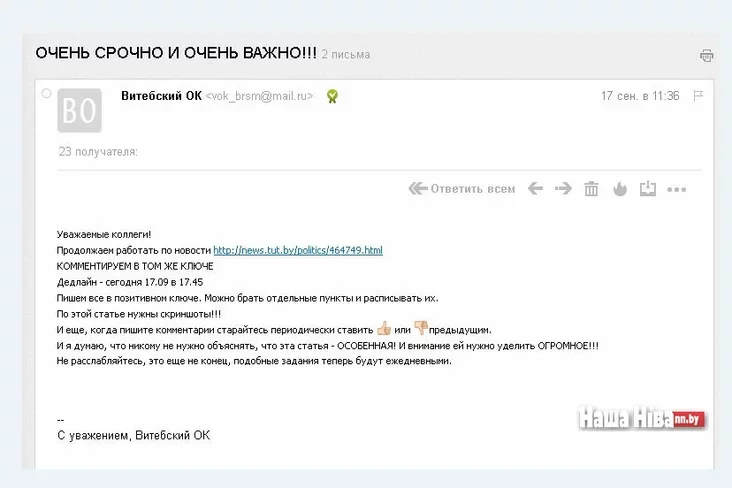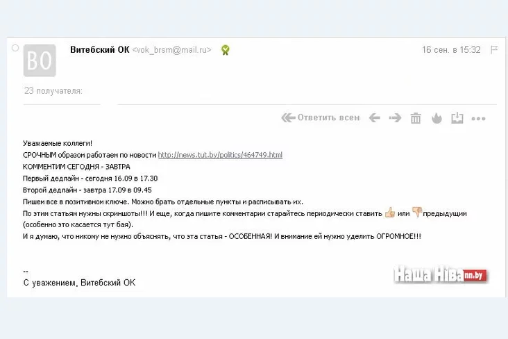 Читатели прислали «Нашей Ниве» копии электронных писем Витебского обкома Белорусского республиканского союза молодежи. В них штатным сотрудникам местных организаций БРСМ даются инструкции, какие комментарии оставлять под теми или иными статьями в белорусских СМИ.