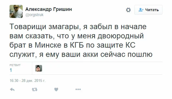 «У меня брат в Минске в КГБ по защите КС служит. Я ему ваши акки сейчас пошлю», — написал московский журналист в своем Twitter-е. Такая запись вызвала новую волну смеха, гнева и нецензурных высказываний в его адрес.