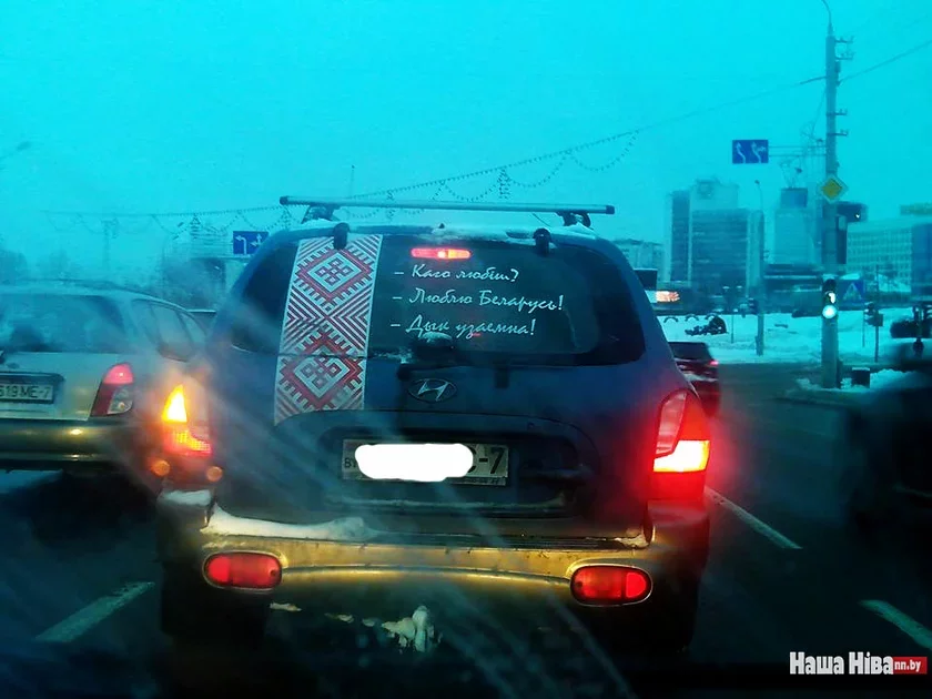 Hyundai с таким белорусским орнаментом и знаменитым паролем повстанцев Калиновского встретился корреспонденту «Нашей Нивы» на минской улице.