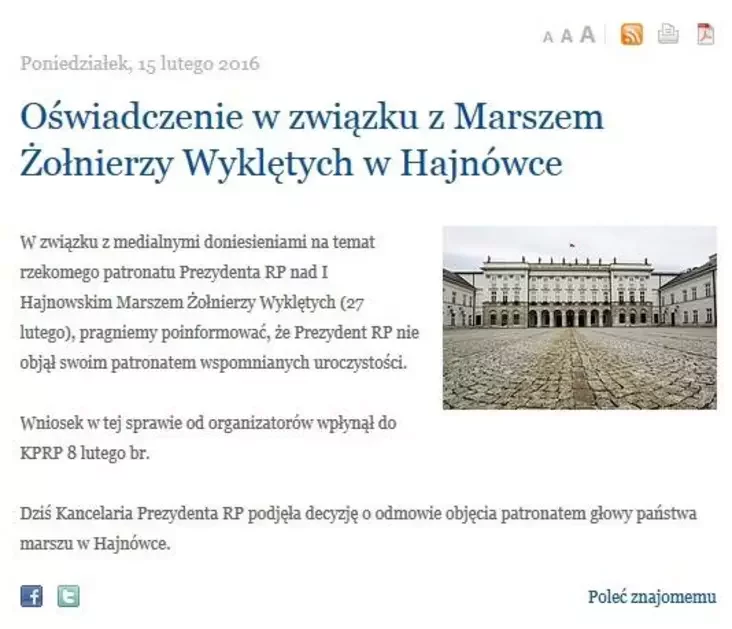 Президент Польши демонстративно отказался принять под патронаж марш памяти «Бурого» в Гайновке