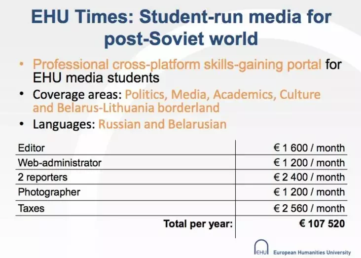 Европейский гуманитарный университет (Вильнюс) ищет средства и сотрудников для студенческой газеты. В то, что когда-то называли «многотиражкой», только эпохи интернета, набирают редактора, репортеров и веб-администратора.