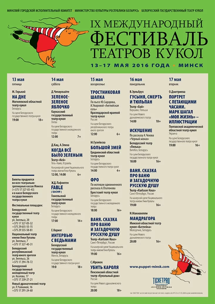 Спектакли форума пройдут на пяти площадках города - Белорусского государственного театра кукол, Нового драматического театра, Белорусского республиканского театра юного зрителя, Белорусского государственного молодежного театра и малой сцене Национального академического театра имени Янки Купалы.