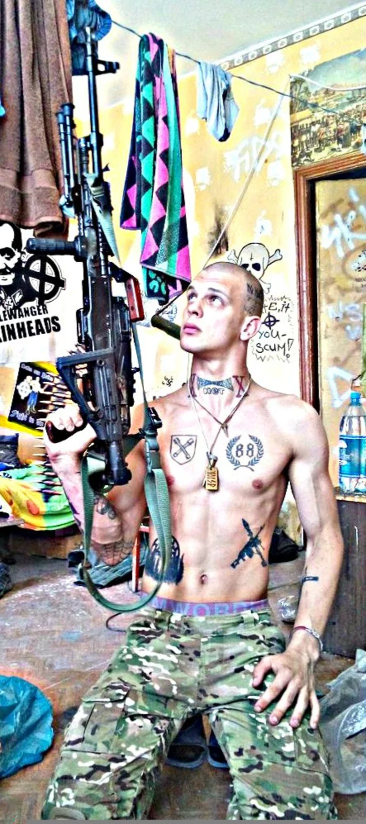На груди у него набита 88 — это цифровая аббревиатура, означающая «Хайль Гитлер».