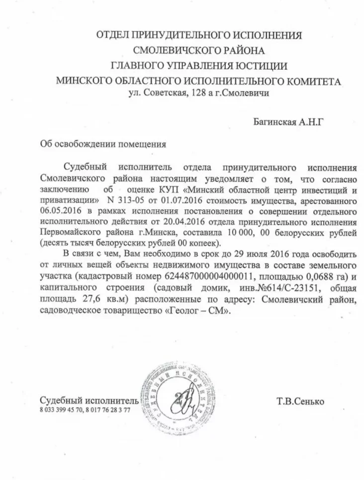 Причем срок, к которому Богинская обязана освободить арестованную ранее дачу от личных вещей, завершается 29 июля. Именно письмо такого содержания «Об освобождении помещения» получила недавно Нина Богинская с отделом принудительного исполнения Смолевичского района.