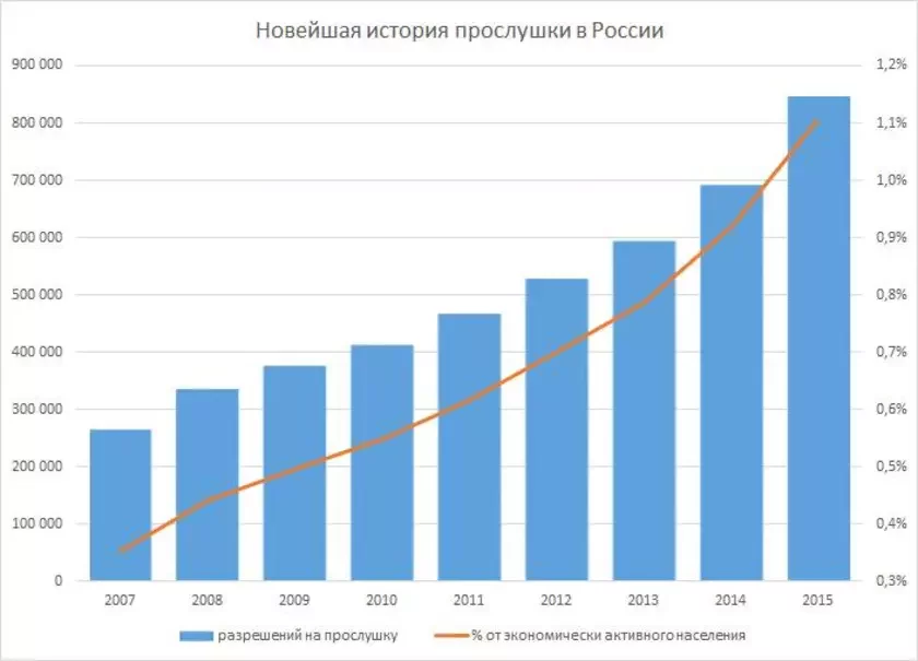 Численность тех, кого прослушивают в России, за 8 лет возросла с 270 тыс. до 840 тыс.