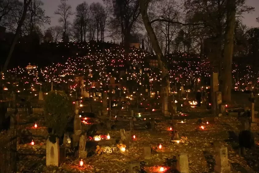 Люди приносят свечи на могилы и наводят порядок на кладбище перед наступлением зимы.