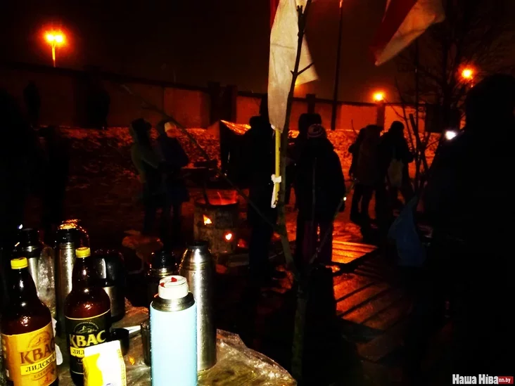 Под ногами — поддоны, чтобы не промокали и не мерзли ноги. Мимо палатки иногда прохаживаются омоновцы. Защитники Куропат поддерживают с правоохранителями конструктивный контакт.