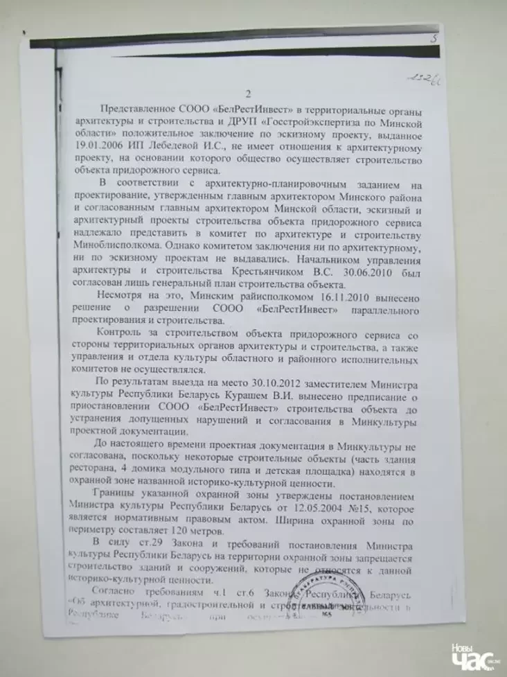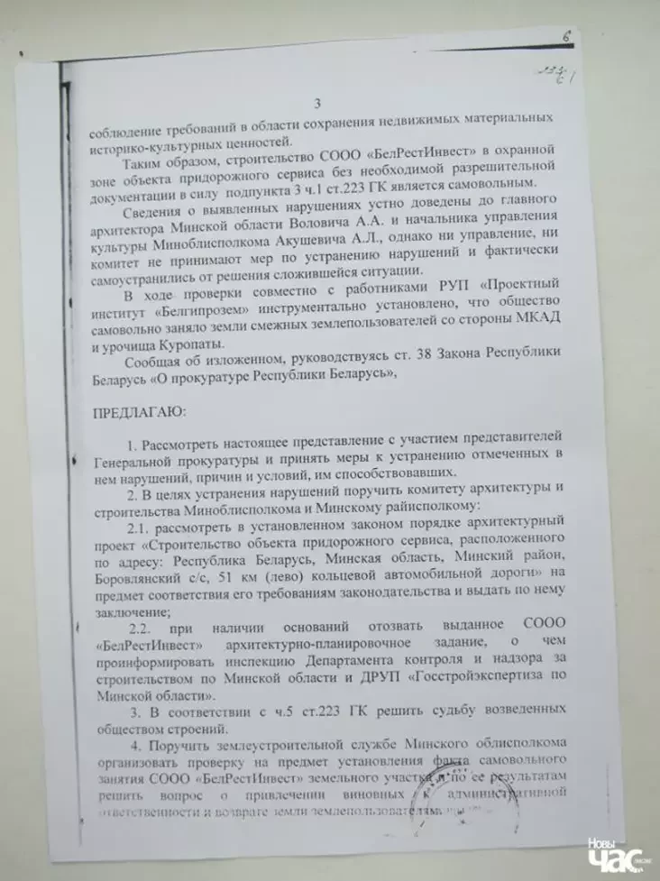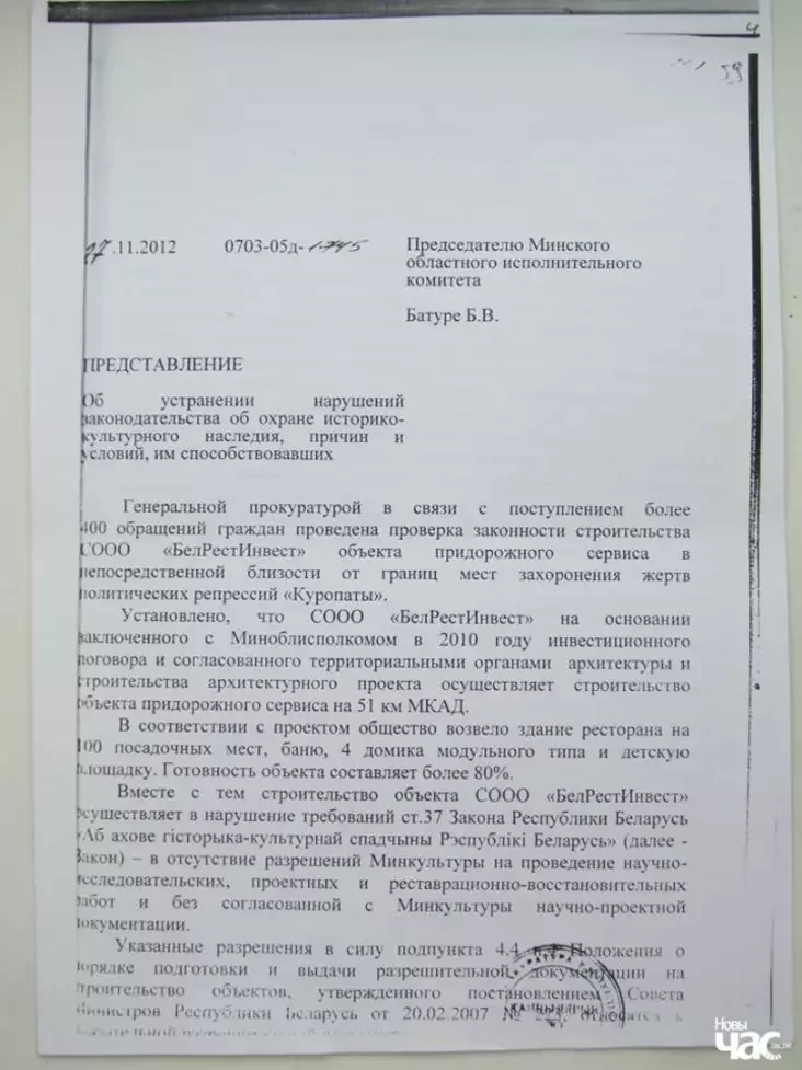Газета «Новы час» опубликовала фотокопию представления, которое Генеральная прокуратура выносила председателю Миноблисполкома Борису Батуре в 2012 году.