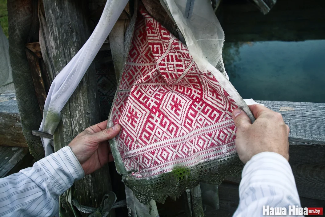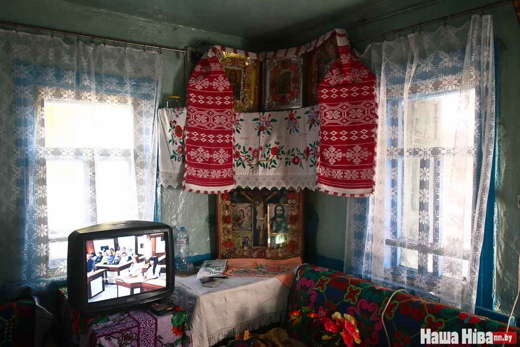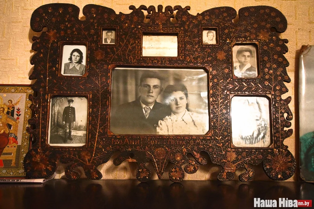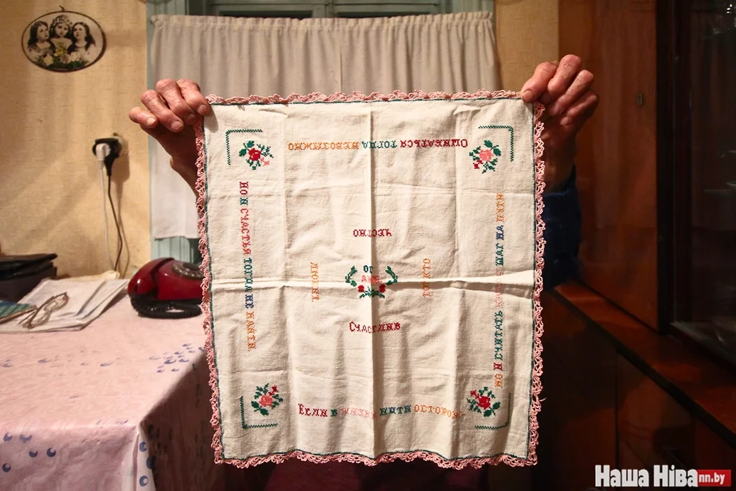 Во вдовьем доме Ганны обращает на себя внимание по-мастерски оформленная рамка для фото. «Это муж мне сделал на день рождения — повез меня в Чечерск фотографироваться. А я ему платок вышила. Он его сохранил, не утирался им». Ганна несет из шкафа святыню с философским четверостишием о любви.