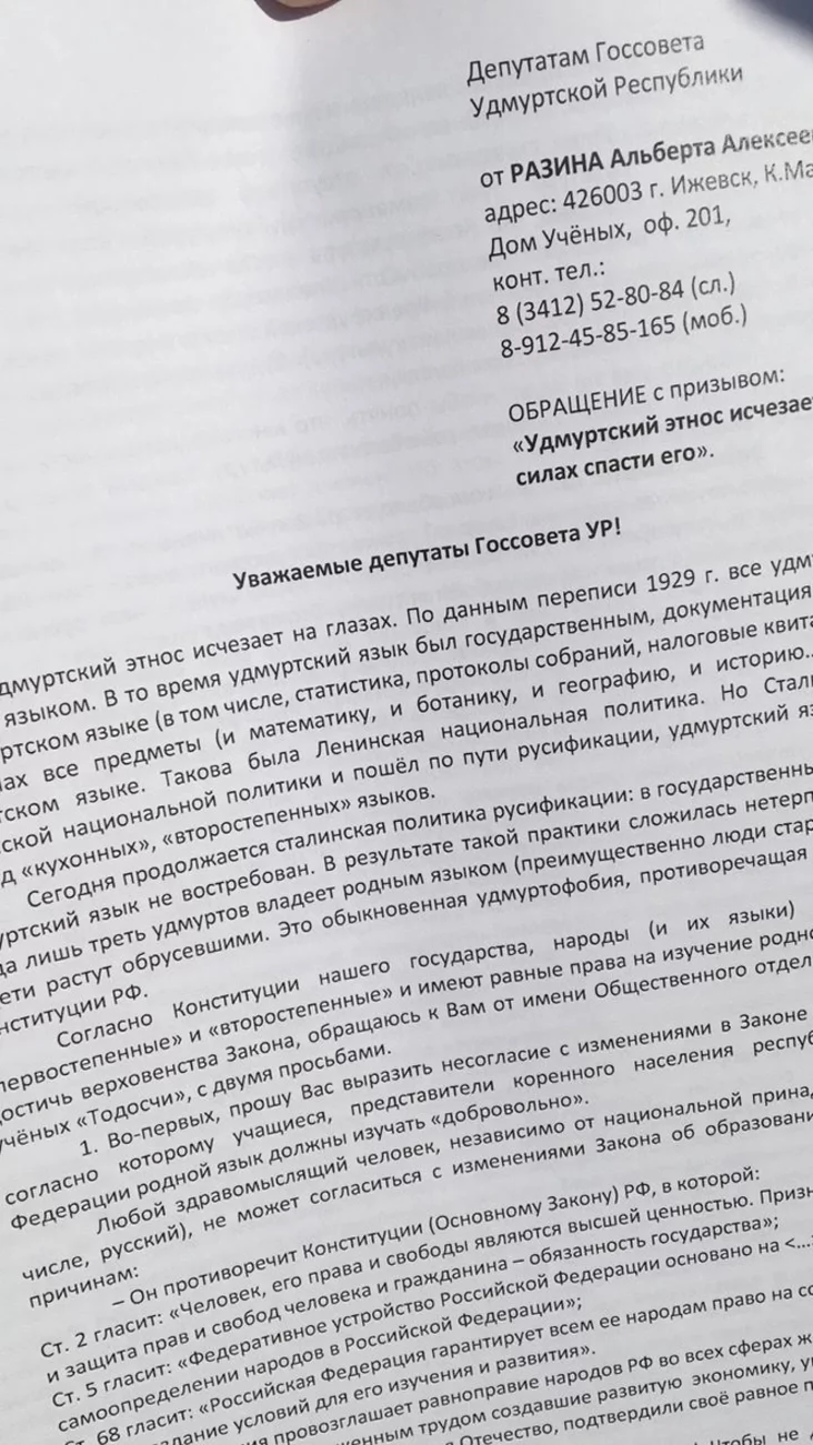 Ученый протестовал против русификации удмуртов в России, пишет сайт udm-info.ru. С собой у него был плакат со словами Расула Гамзатова: «Если завтра мой язык забудут, я готов сегодня умереть».