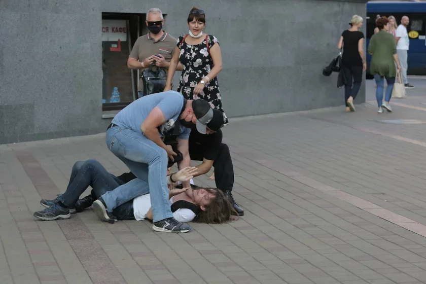 Минск, 8 августа. Лица в штатском держат демонстранта за горло при задержании.