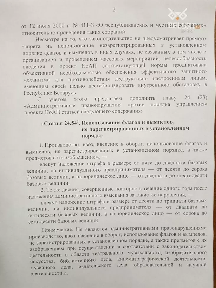 Член Совета Республики Сергей Сивец внес предложение по изменениям в Кодекс об административных правонарушениях. Фактически Сивец предлагает запретить всю «незарегистрированную» символику. Под запрет попадет и бело-красно-белый флаг.