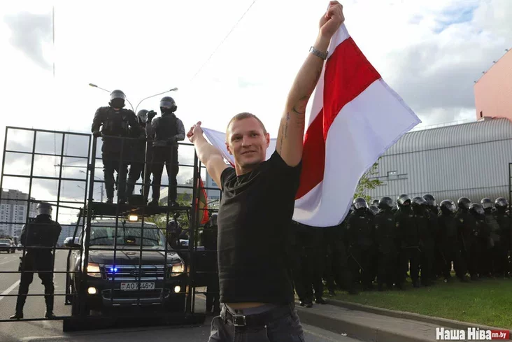 «Поскольку бело-красно-белый флаг стал флагом всеобщего протеста, а не только национально ориентированных политических сил, то перед правоохранительными органами встал вопрос использования флага частными лицами, что не запрещено и не подпадает ни под какие статьи. Так же и люди, которые придумывают флаги микрорайонов, не делают ничего запрещенного. Люди имеют полное право вывешивать флаги на балконах, размещать их изображения на майках», — объясняет Чаусов.