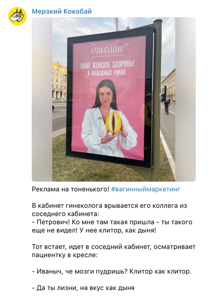 Фудблогер Павел «Кокобай» Крамарь запостил в своем канале рекламу клиники женского здоровья EVACLINIC, добавив бородатый пошлый анекдот про гинекологов и клитор, а также едкий хэштег «вагинный маркетинг».