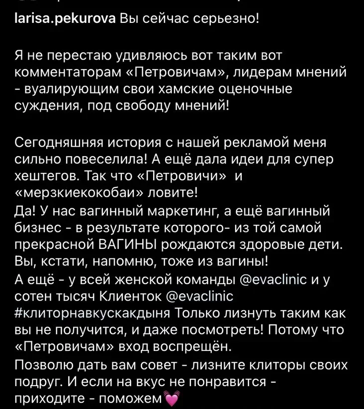 В итоге не выдержала основательница клиники Лариса Пекурова. Она публично ответила Павлу Крамарю, опубликовав пост у себя в инстаграме.