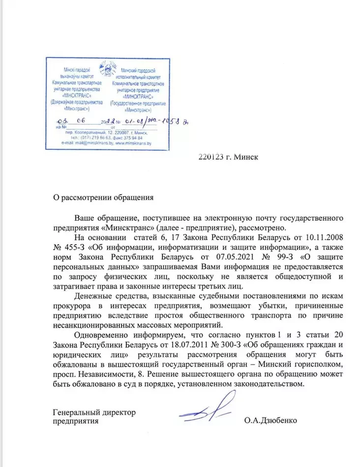 Читательница «Нашай Нівы» послала электронное обращение в Минсктранс с этими вопросами. Ответ пришел под подписью генерального директора предприятия Олега Дюбенко.