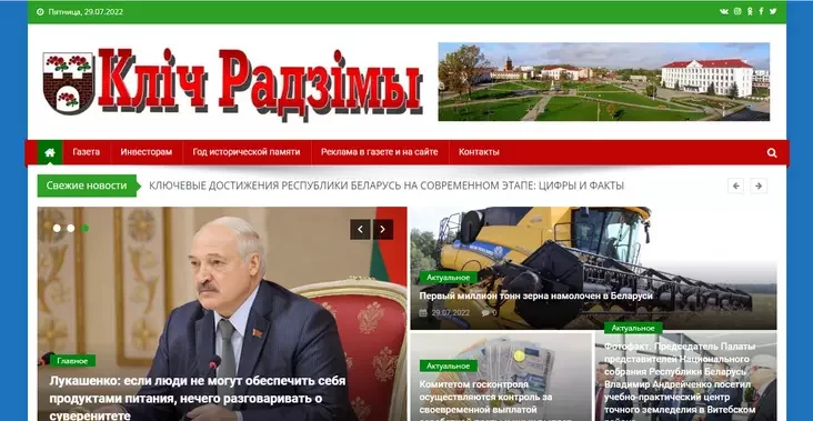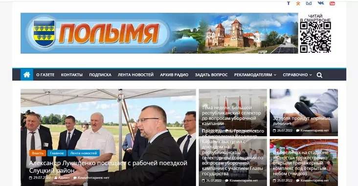 Идем за кореличскими новостями на сайт местной районки «Полымя» — и едва видим разницу с прошлыми ресурсами из подборки. Сайты похожи друг на друга, как близнецы: Лукашенко на главной странице, информация от ГАИ и из крупных госресурсов, уборочная и БРСМ.