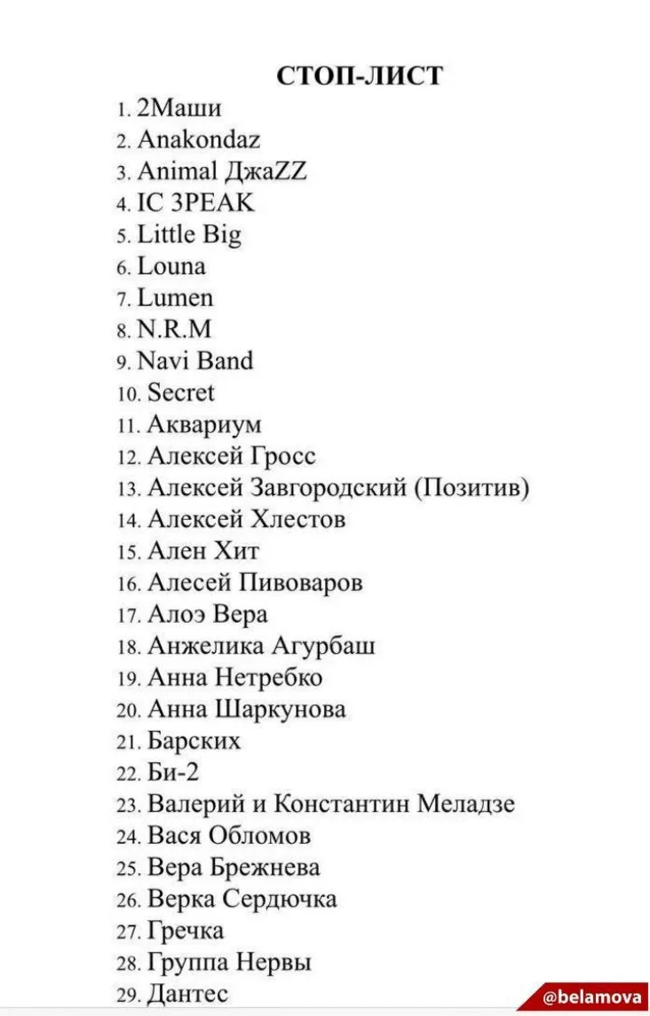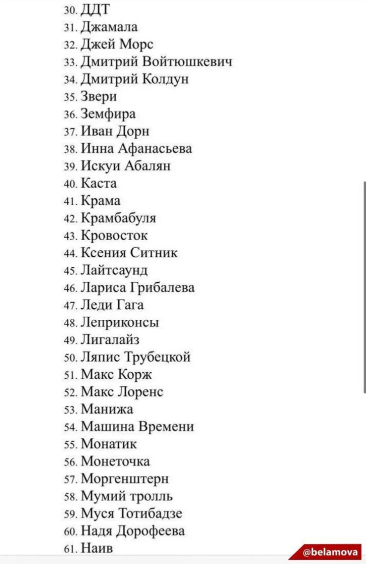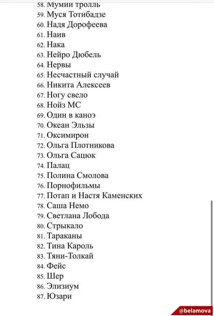 В списке 87 артистов и групп. Ранее стало известно, что именно такой «черный список» был утвержден Минкультом. Сейчас его доводят даже до средних учебных заведений.